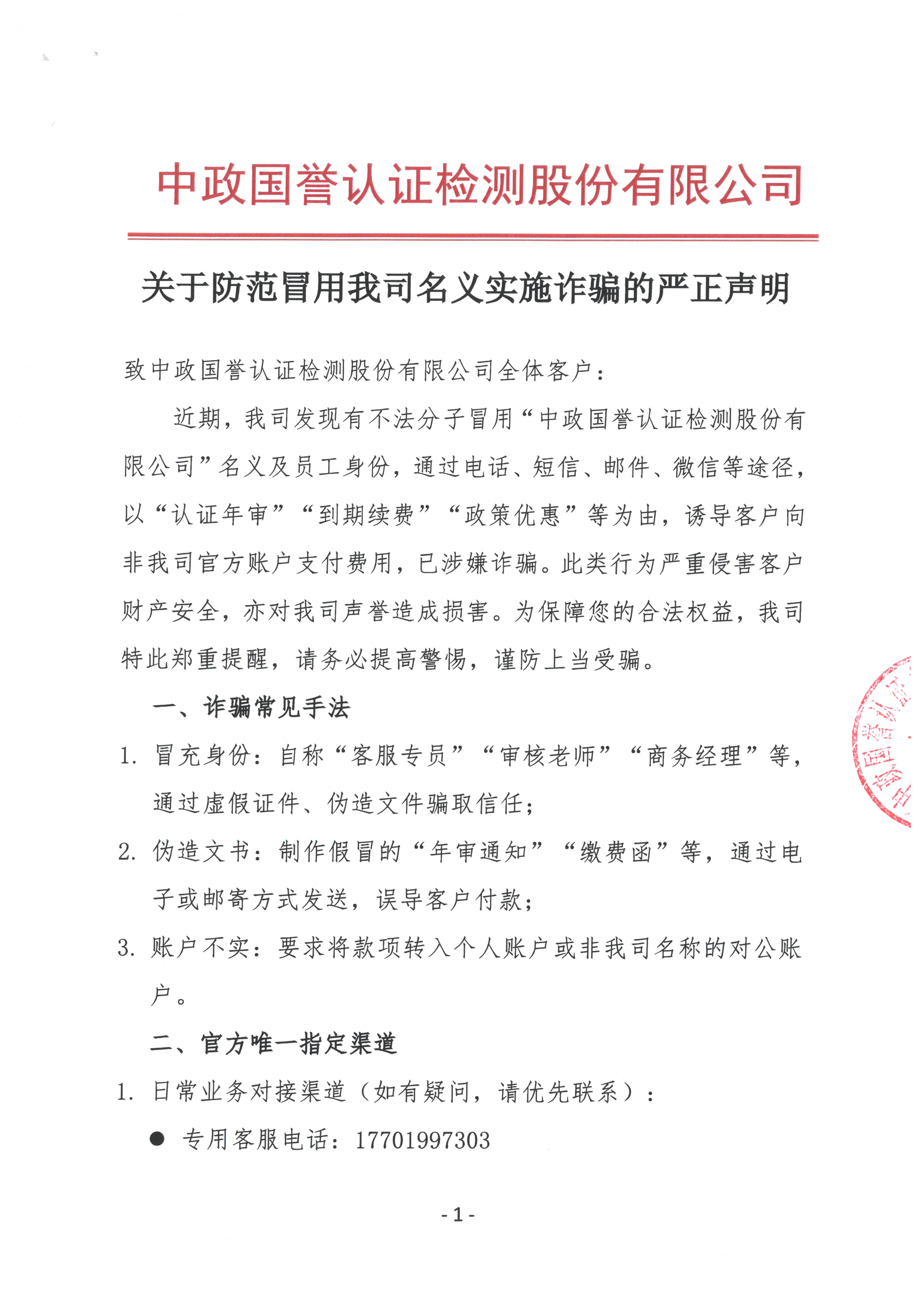 近期,我司发现有不法分子冒用“中政国誉认证检测股份有限公司”名义及员工身份,通过电话、短信、邮件、微信等途径,以“认证年审”“到期续费”“政策优惠”等为由,诱导客户向非我司官方账户支付费用,已涉嫌诈骗。此类行为严重侵害客户财产安全,亦对我司声誉造成损害。为保障您的合法权益,我司特此郑重提醒,请务必提高警惕,谨防上当受骗。