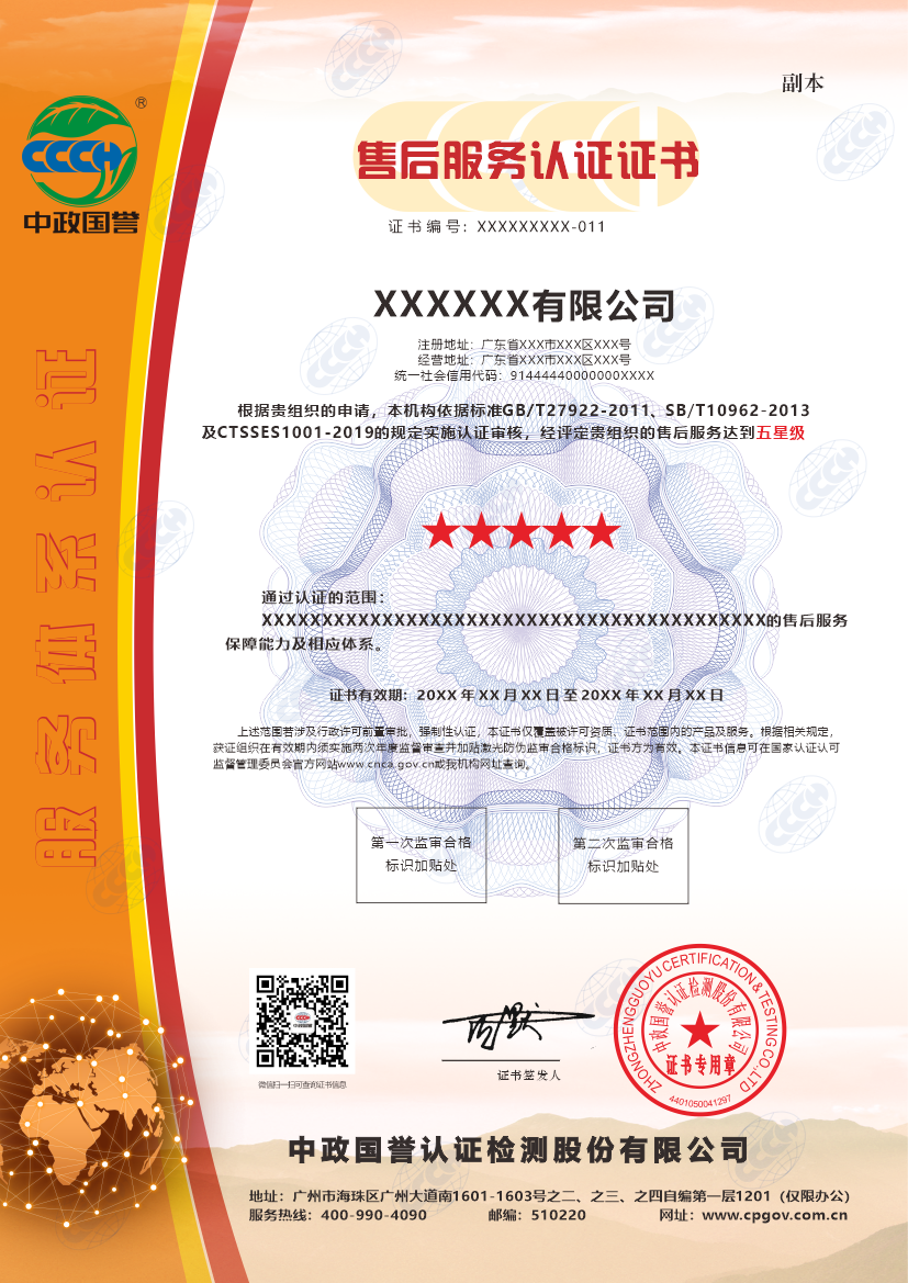 通过对这些“服务制度完整性”与“服务有效性”的综合评定,认证机构将为企业颁发相应星级(如五星级、四星级等)的认证证书。这不仅是企业售后服务能力的权威证明,更是其服务管理成熟度与客户导向经营理念的直观体现。