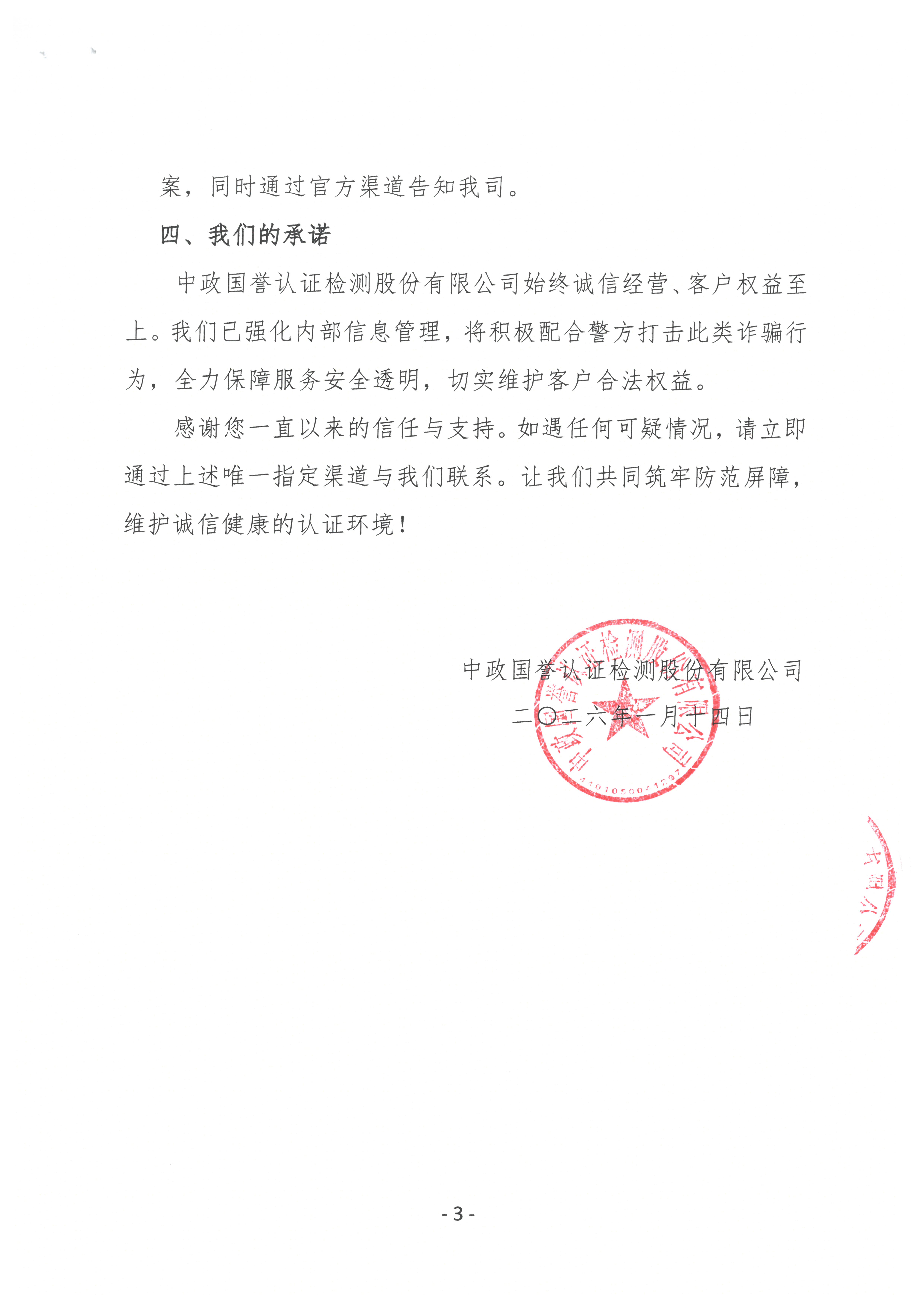 中政国誉认证检测股份有限公司始终诚信经营、客户权益至上。我们已强化内部信息管理,将积极配合警方打击此类诈骗行为,全力保障服务安全透明,切实维护客户合法权益。