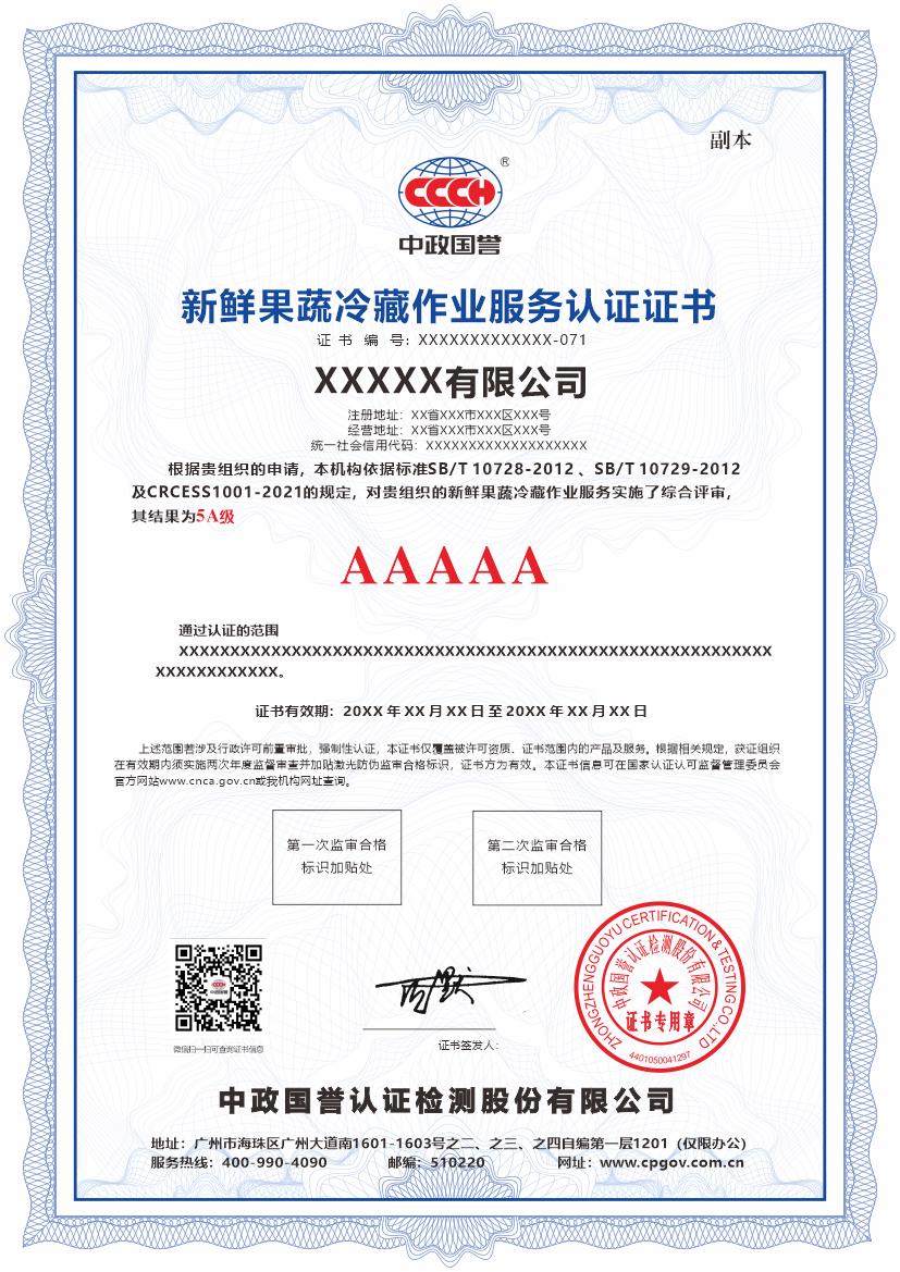 通过对这些“技术特性”与“管理服务特性”的综合评定,认证机构将为通过评估的申请方颁发相应等级的认证证书。这不仅是其冷藏作业服务专业性与规范性的权威证明,更是其食品安全与供应链管理能力成熟度的重要标志。