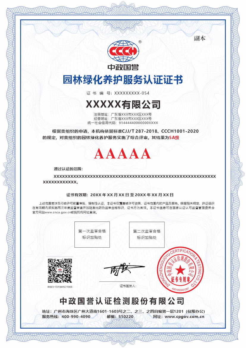 通过对单位养护服务“制度的完备性”、“操作的规范性”与“养护成果的实效性”进行综合评定,认证机构将为单位颁发相应等级的认证证书。这不仅是单位养护管理水平符合专业标准和行业最佳实践的有力证明,更是其长期保障绿化成果品质、兑现专业服务承诺的重要标识。