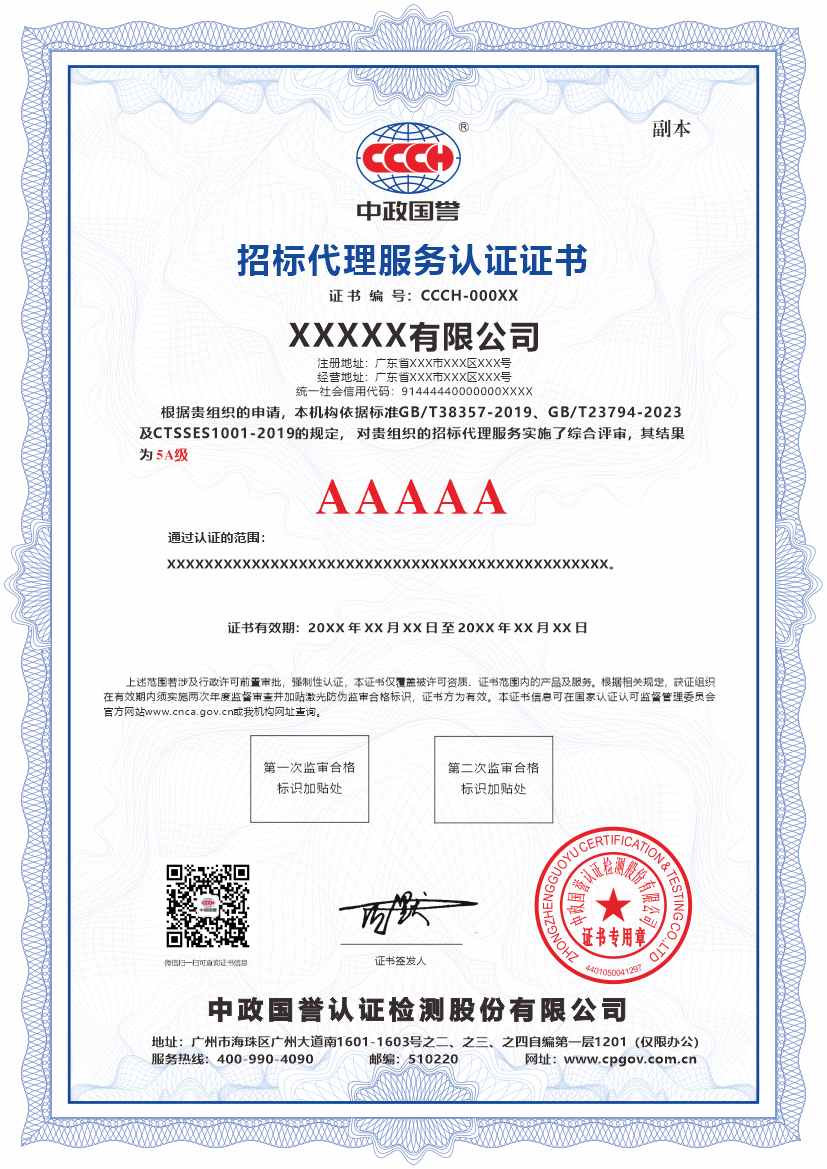 该认证是对招标代理机构服务能力与信用水平的双重认可,采用“全周期-全要素-全流程”三位一体的认证,全面规范机构的业务操作、服务制度和服务质量,确保其符合行业标准和客户需求。